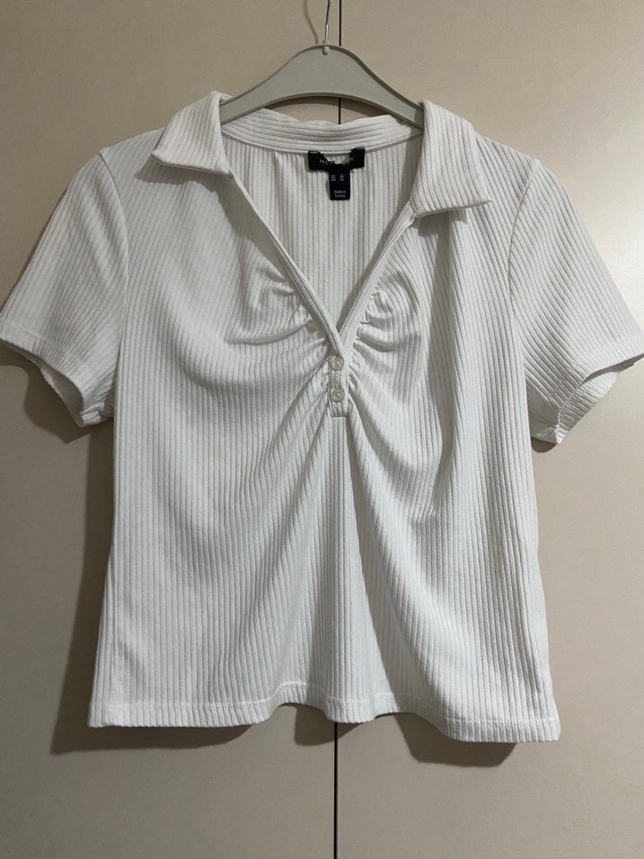 Düğmeli V Yaka beyaz Kısa Kollu Kadın bluz