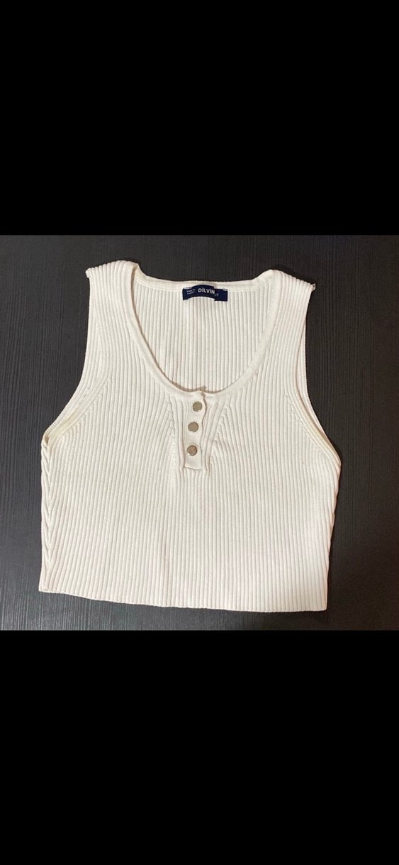 Pamuk kumaştan yapılmış, düğmeli ve V yakalı beyaz, kolu olmayan, dar kesim kalin croptop. Günlük sokak stili için uygundur.