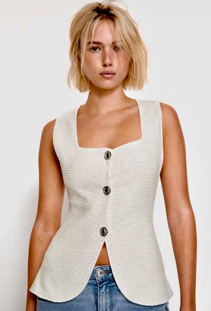 Düğmeli ve V yakalı beyaz triko yelek, regular fit ve kolsuz tasarıma sahip. Minimalist ve trend sokak stili, günlük kullanıma uygun. ✨
