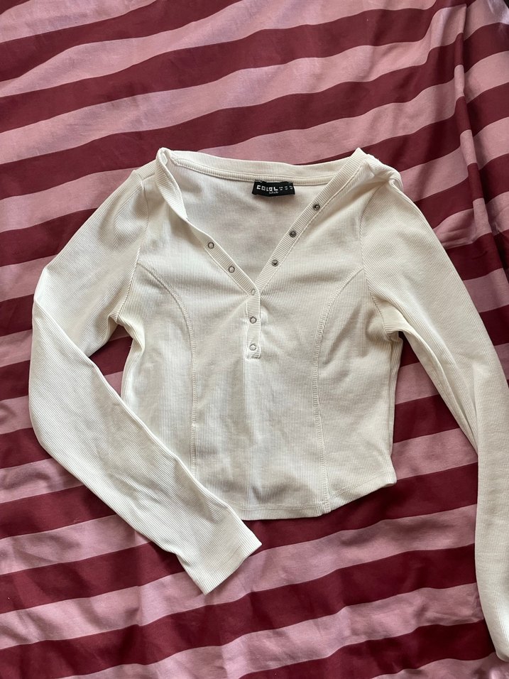 Pamuk kumaştan üretilmiş, düğmeli V yaka, uzun kollu ve beyaz renkte rahat kesim kadın bluzu. Günlük sokak stiline uygundur.