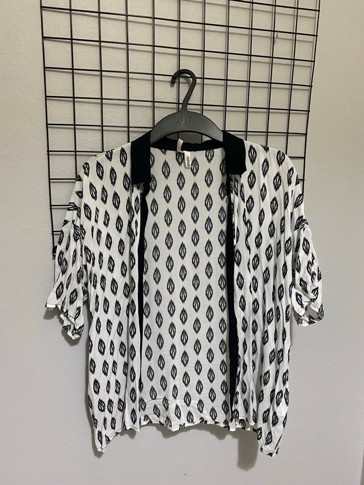 Düğmeli ön kısmı ve V yaka detaylı, kısa kollu, bol kesim kadın gömleği. Monokrom soyut desenli, hafif sentetik kumaştan, günlük kullanıma uygun.