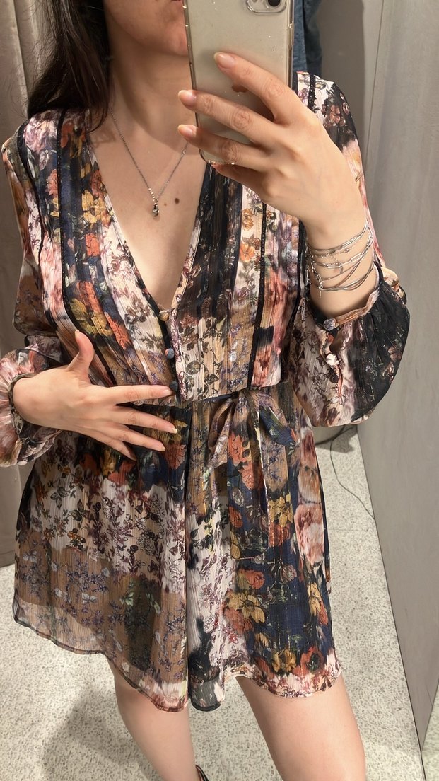 Düğmeli, V yaka, uzun kollu, bol kesim midi elbise. Desenli çiçek desenli, çok şık bi elbise 1 kez giydim