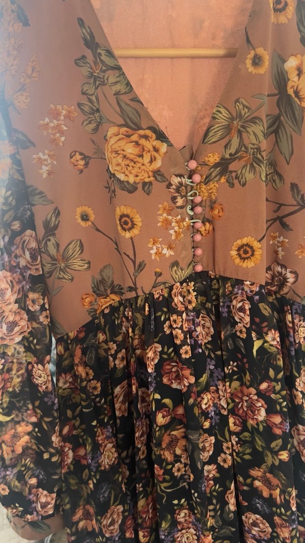 Kahverengi uzun elbise, çiçek desenli, V yaka ve düğmeli ön kısmıyla dikkat çeker. Bol kesim ve askılı kollarıyla günlük kullanıma uygundur.