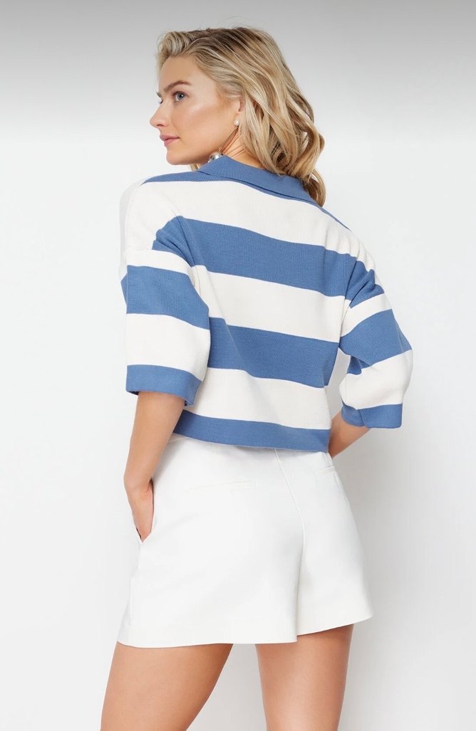 Pamuklu kumaştan yapılmış, beyaz ve mavi çizgili, kısa kollu, V yakalı ve düğmeli bol kesim crop top. Günlük kullanıma uygun.