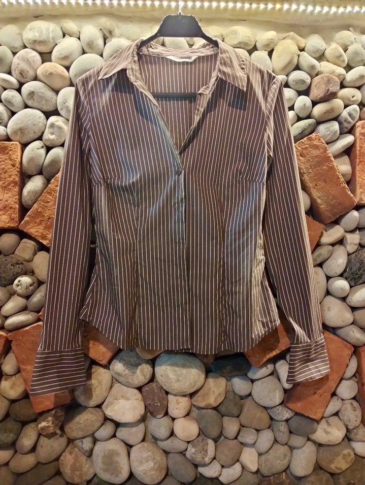 Düğmeli, uzun kollu, V yakalı kadın gömleği, kahverengi ve gri çizgili desenli, çok şık sayılı kullanıldı. 0 fiyatı 1200tl elden çıkarmak için uyguna bırakıyorum.