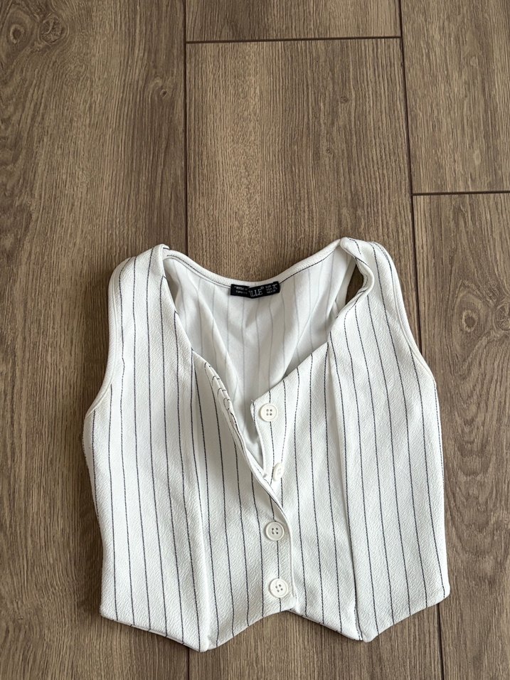 Düğmeli, V yakalı, beyaz keten yelek, gri çizgili. Normal uzunlukta, regular fit, günlük sokak stili için uygundur.
