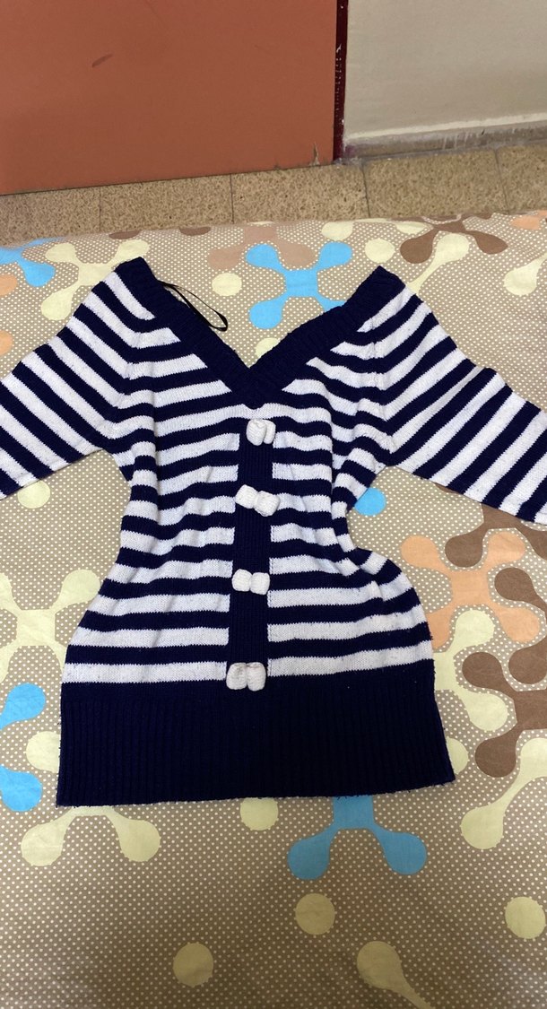 V yaka ve düğmeli kapamalı, fitted kesim mavi-beyaz çizgili triko hırka. Uzun kollu ve midi boy, rahat günlük giyim için uygundur.