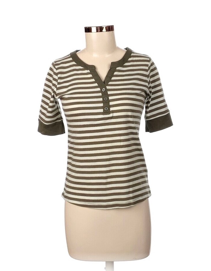 Düğmeli V yakalı, kısa kollu, haki çizgili pamuk tişört. Normal midi boyda, rahat ve şık günlük kullanım için uygundur.