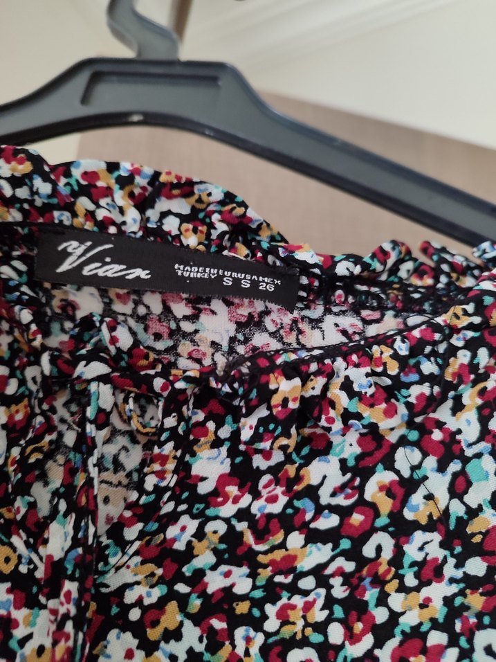 Düğmeli, kısa kollu, V yaka, bol kesim hamile bluzu. Çok renkli desenli, yumuşak sentetik kumaştan, günlük sokak stili için uygun.
