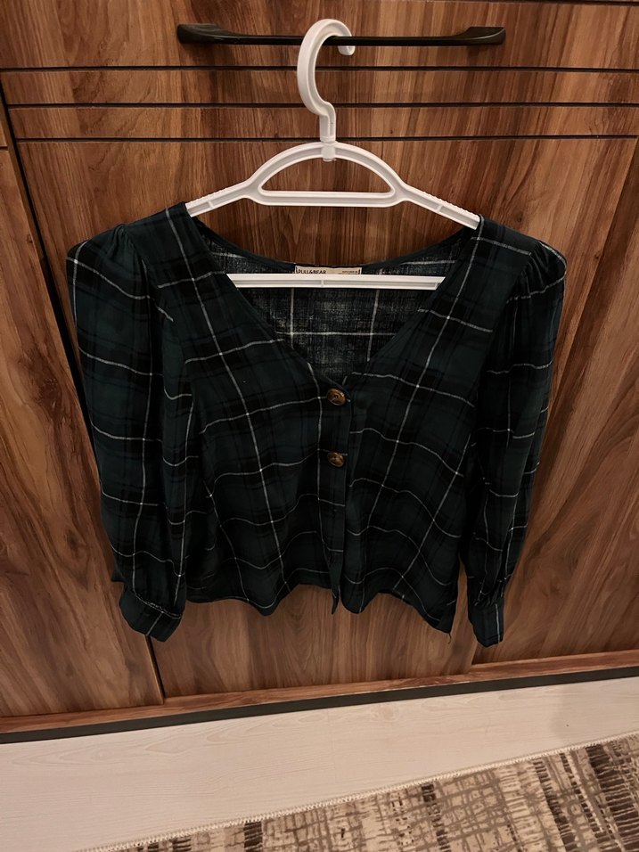 Düğmeli, uzun kollu, bol kesim bu koyu kahverengi kadın gömlek, yumuşak keten kumaştan olup midi boy ve V yakalıdır. Ekose deseniyle rahat sokak stiline uygundur.