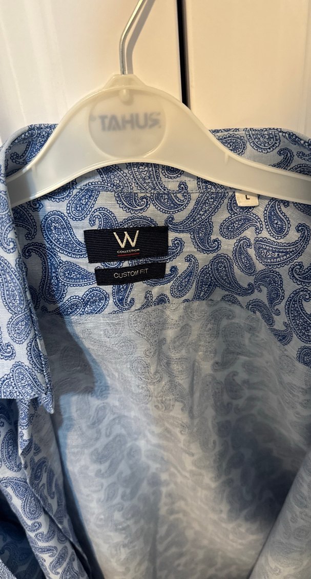 Düğmeli, V yaka, mavi-gri baskılı desenli, sentetik kumaştan erkek gömleği. Rahat kesim, günlük ve ofis kullanımı için uygundur.