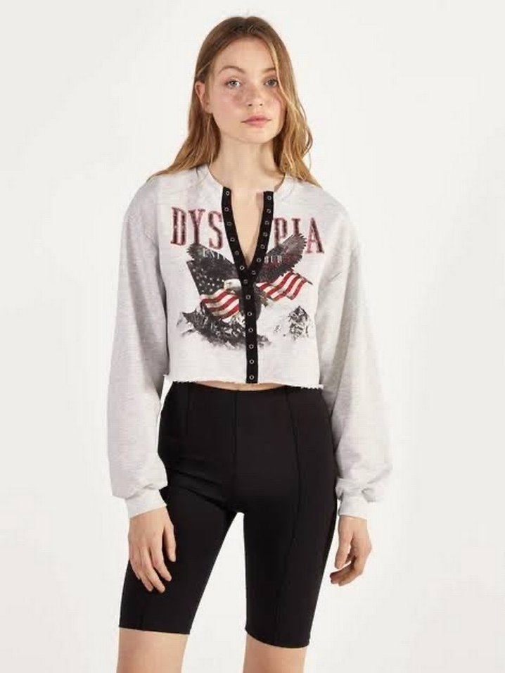 Pamuklu, düğmeli V yaka ve baskılı desene sahip, kısa kesim gri crop sweatshirt, rahat sokak stili için uygundur.