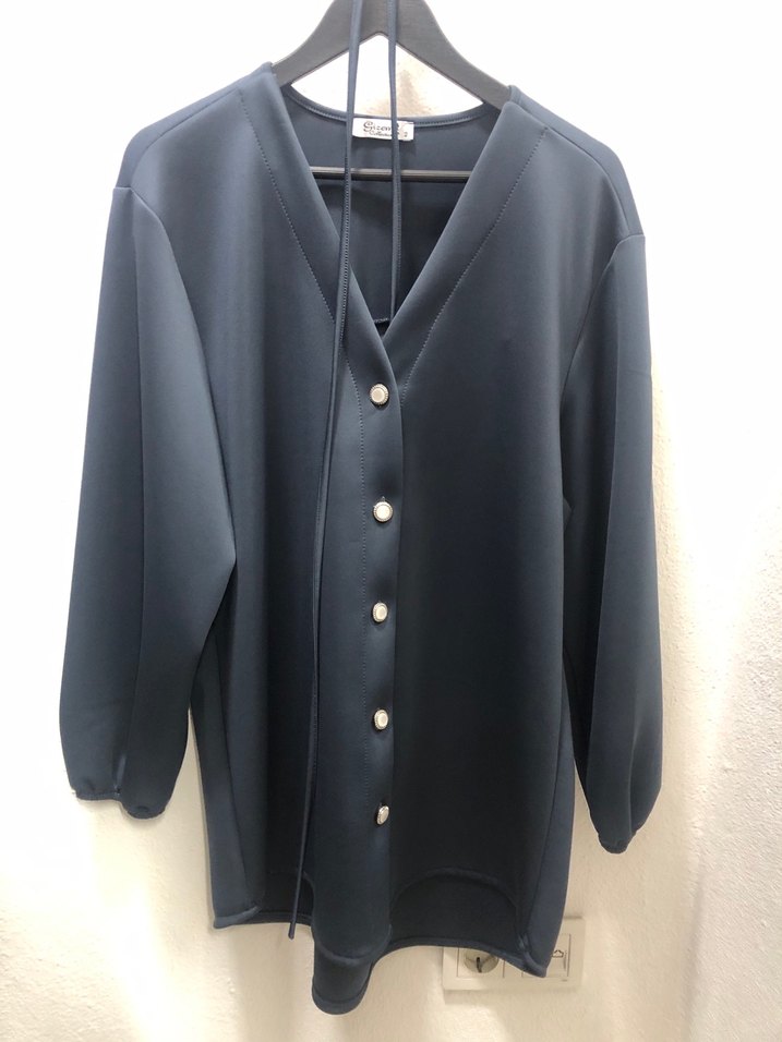 Düğmeli, V yaka, uzun kollu, rahat kesim gri kadın bluz. Yumuşak sentetik kumaştan, ofis kullanımı için uygun.