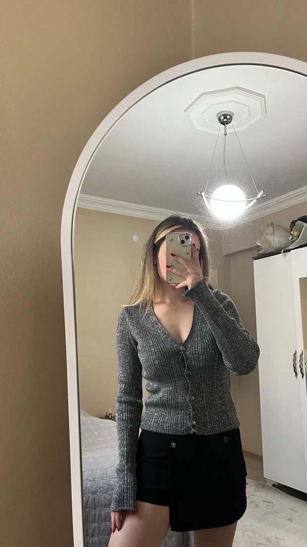 Düğmeli, V yakalı, uzun kollu, gri triko kadın kazak. İnce ve vücuda oturan kesimi günlük rahat kullanıma uygundur.