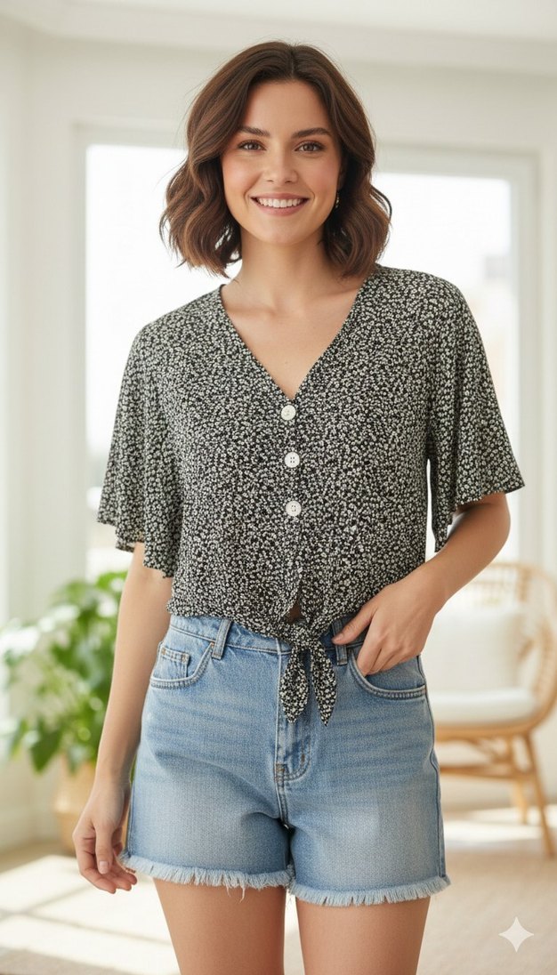 Gri, V yakalı, düğmeli kısa kollu, bol kesim ve bağlamalı detaylı bluz. S M uyumlu