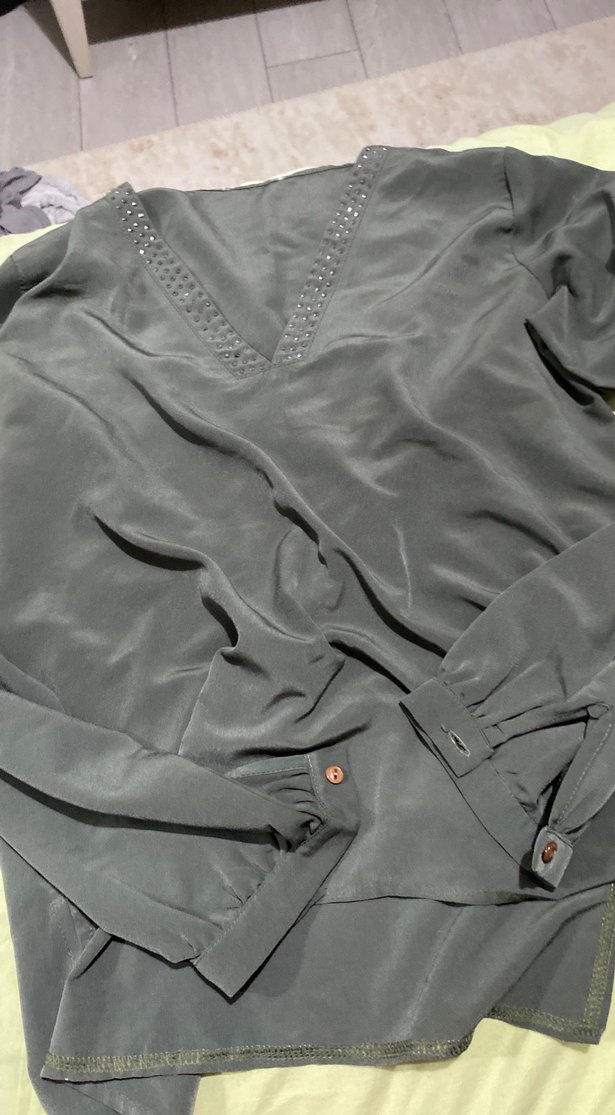 Düğmeli uzun kollu, V yaka gri saten kumaştan bol kesim bluz. Desensiz, günlük rahat kullanıma uygun bohem tarzda.