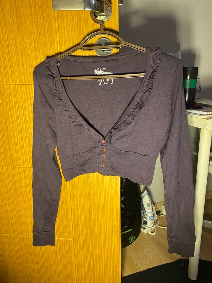 Düğmeli, V yakalı, uzun kollu, gri triko hırka, günlük rahat kullanım için uygundur.