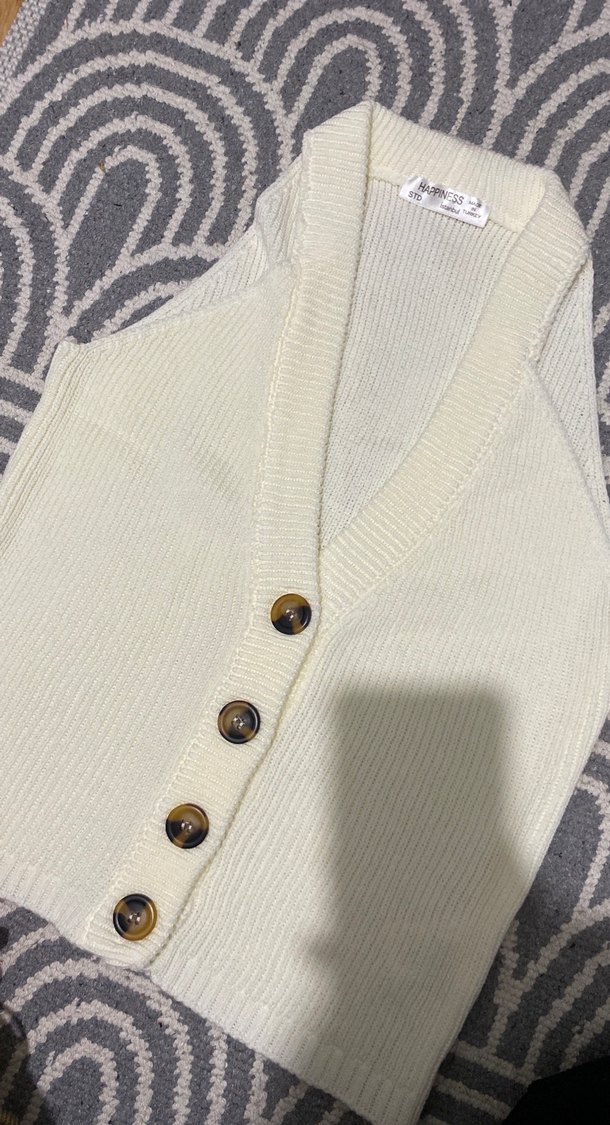 Düğmeli, V yakalı ve ince örgüden üretilmiş kolsuz, fitted kesim kadın yelek. Beyaz renkte, rahat sokak stili için uygundur.