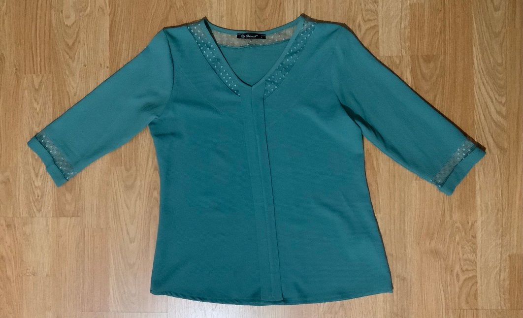 Düğmeli, V yaka, uzun kollu ve bol kesim turkuaz bluz. günlük kullanım için uygundur.