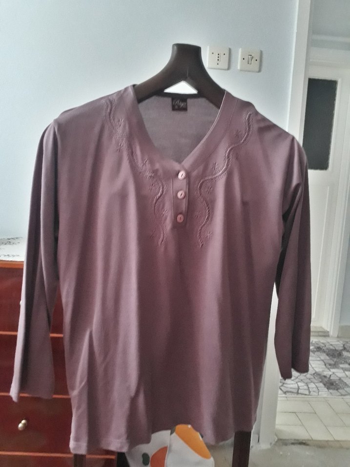 Gül kurusu renkte, düğmeli ve V yakalı bu kadın bluz, uzun kollu ve bol kesimdir. İpek gibi kumaşı ve nakış detaylarıyla günlük kullanıma uygundur. Çok az kullanıldı, yeni gibidir. Fazlalıktan satıyorum.