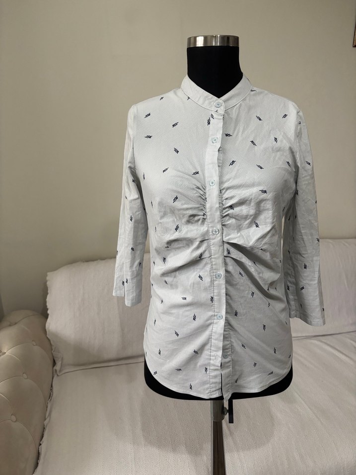 Pamuk kumaştan yapılmış, düğmeli, V yaka ve uzun kollu mavi kadın gömleği. Düzenli kesim ve baskılı desene sahiptir, günlük sokak stili için uygundur.