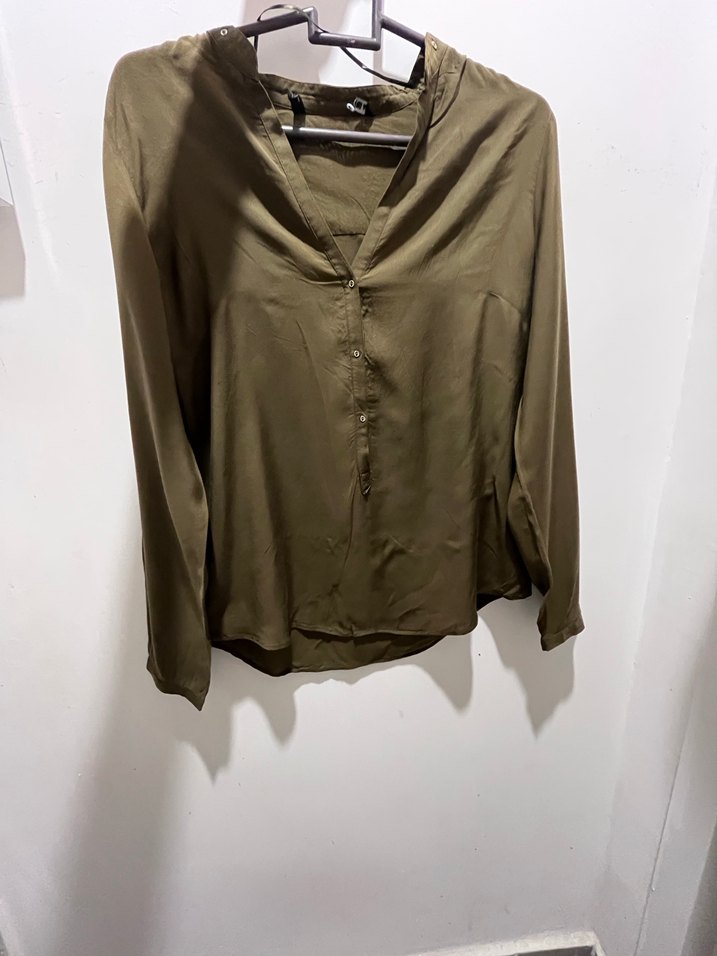 Uzun kollu, V yakalı ve düğmeli kadın gömleği. İpeksi kumaştan, bol kesim ve normal boyda, günlük rahat stil için uygun. Haki renkte.