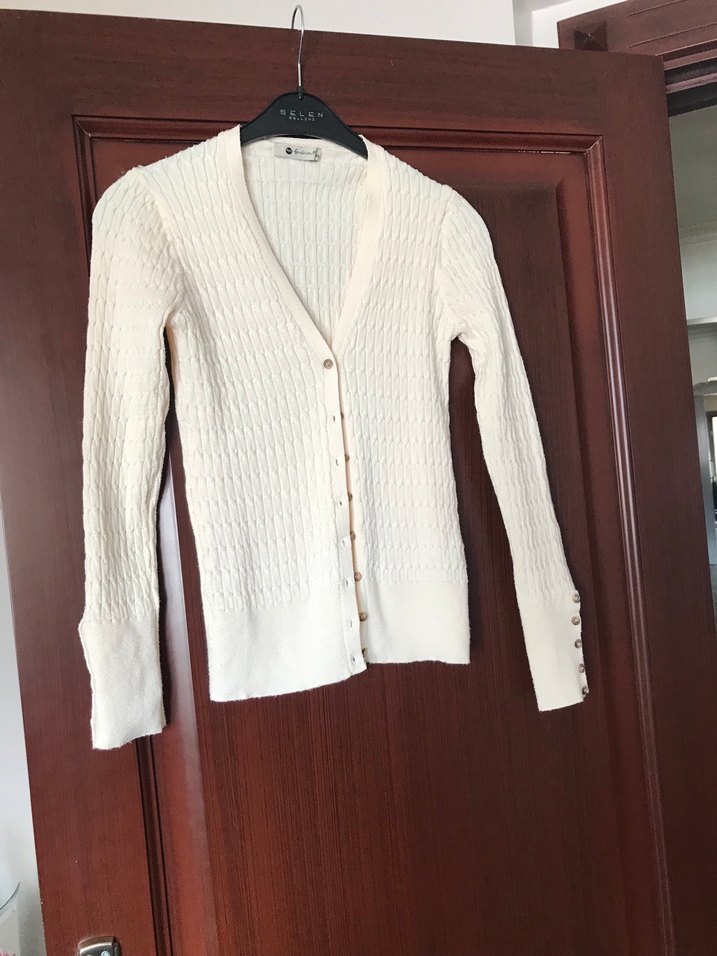Düğmeli, V yakalı, uzun kollu, , ince örme kumaştan yapılmış, günlük kullanıma uygun, modern klasik kesim kadın hırkası. Boy 60 cm iki kol arası 34 cm bir kaç kez kullanıldı %100 polyester marka feshion