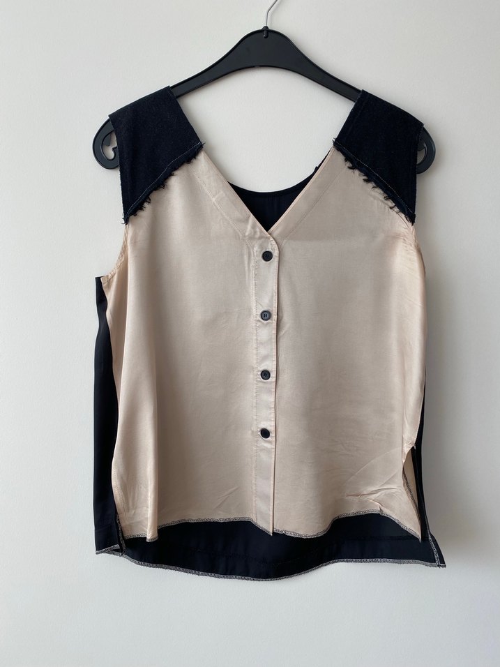 Düğmeli, V yakalı, kolsuz bluz. Hafif ve yumuşak sentetik kumaştan, bol kesim ve midi boyda. Bej ve gri tonlarıyla günlük stil için uygun.