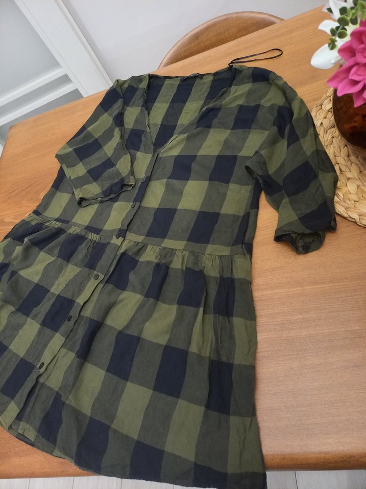 Düğmeli, kısa kollu, V yaka, bol kesim mini elbise. Yumuşak sentetik kumaştan, koyu haki kareli desenli, günlük rahat kullanıma uygun. memnun kalırsınız çok şık bir üründür L/Xl arası içinde uygundur