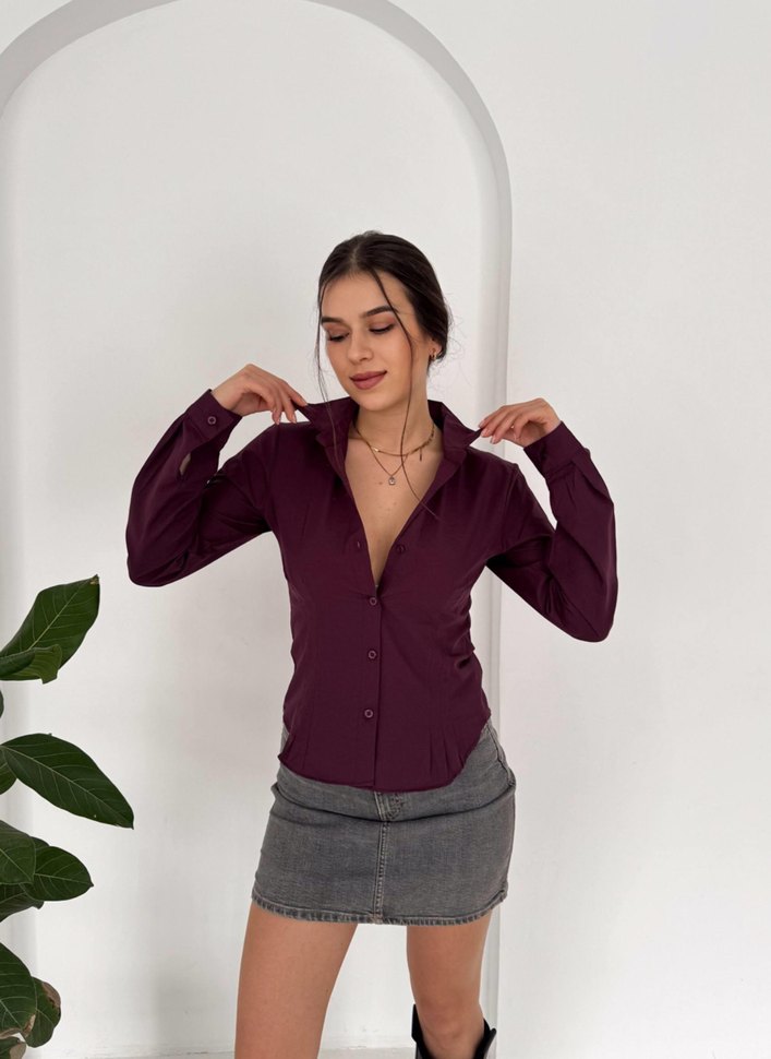 Düğmeli, V yaka ve uzun kollu, vücuda oturan mor kadın bluz. İpeksi dokusu ile günlük rahat sokak stiline uygundur.