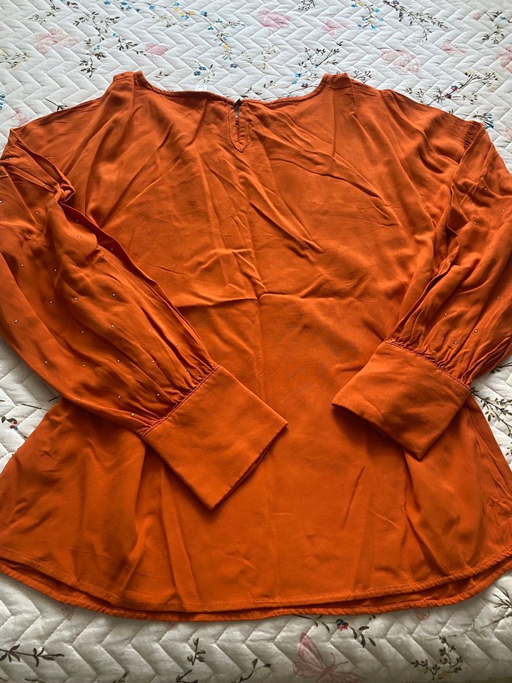 Kadın viskon kumaştan, düğmeli manşetli ve V yakalı, bol kesim parlak kirmit rengi bluz. Günlük kullanıma uygundur.