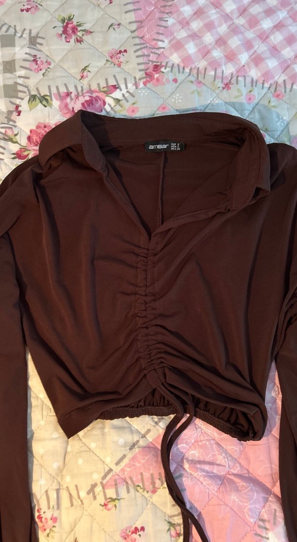 Kahverengi keten kumaştan, düğmeli ve V yakalı, uzun kollu, fit kesim bluz. Ön kısmı büzgülü ve günlük kullanıma uygun.