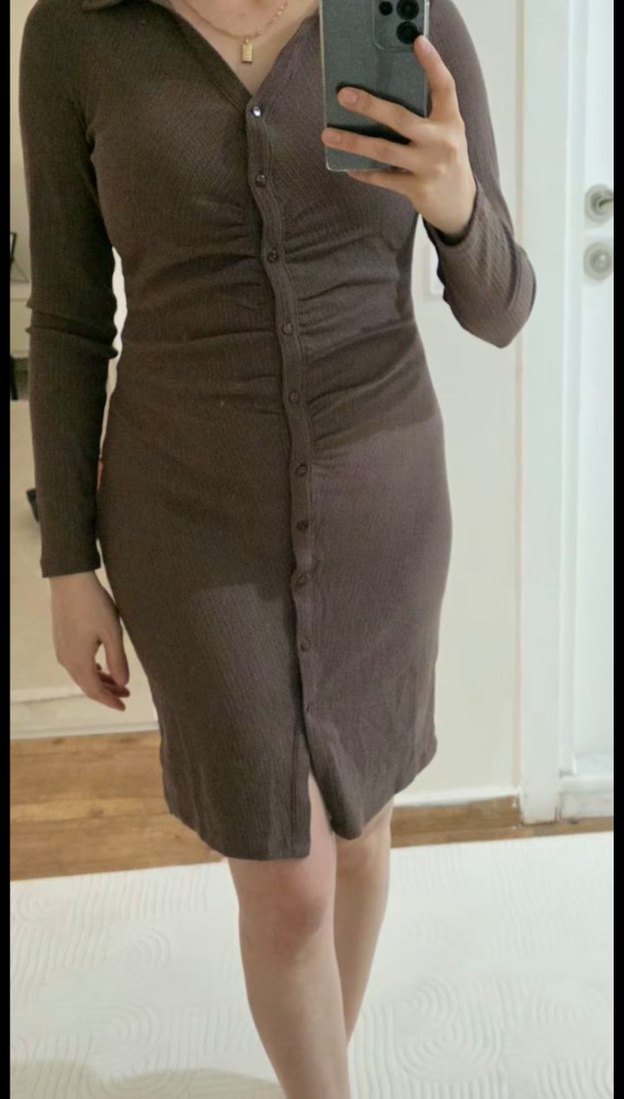 Düğmeli, V yakalı ve uzun kollu kahverengi triko elbise, yumuşak keten kumaştan üretilmiş. Mini boy etiket s ama m ,l bedene de uyar esnek sorunsuz etiketli