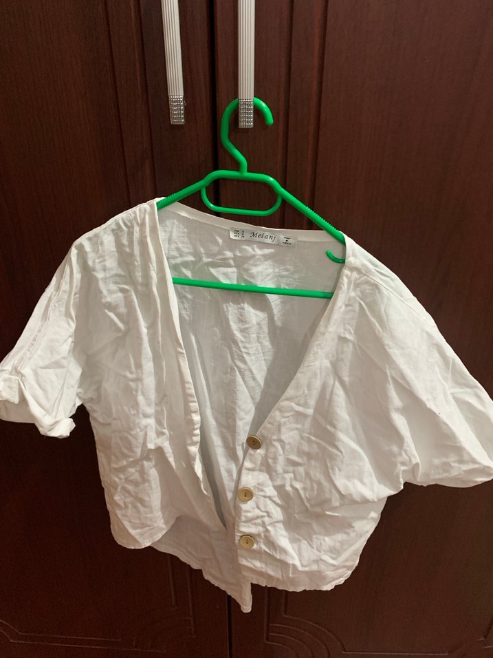 Düğmeli, V yakalı ve kısa kollu beyaz kadın gömleği. Nefes alan keten kumaştan, bol kesim ve normal midi boyda. Minimalist, desensiz, günlük rahatlık için ideal.