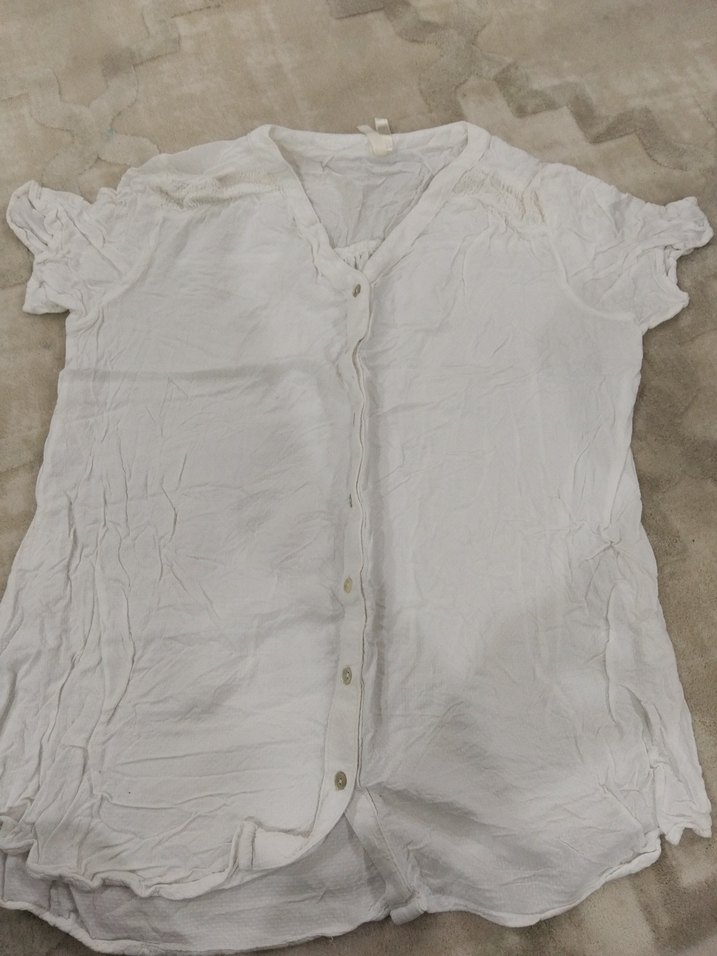 Beyaz keten kadın gömlek, kısa kollu, V yaka ve düğmeli ön detaylıdır. Rahat kesimi ve sade bohem tarzıyla günlük kullanıma uygundur.