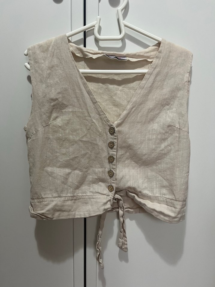 Bej renk, kolsuz kadın yeleği yumuşak keten kumaştan üretilmiştir. V yaka, düğmeli ve bol kesimli midi boydadır, gündelik bohem tarz için uygundur.