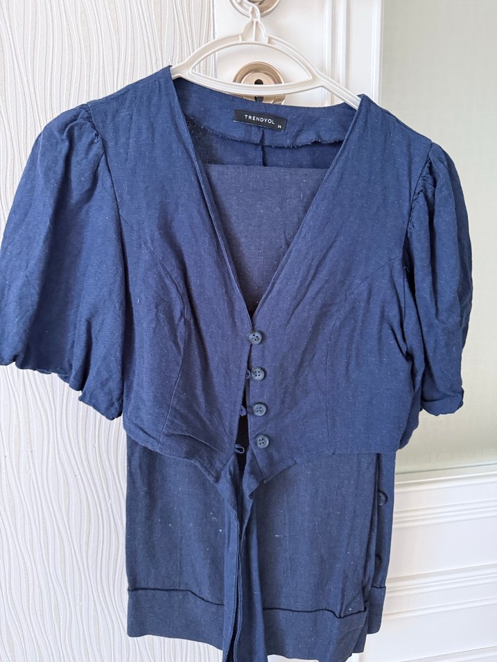 Çok hoş bir takım düğmeli önü bağlamalı ve düğmeli pantolonlu bel ölçüsü vermem gerekebilir belini biraz daraltırmıştım çok az giydim