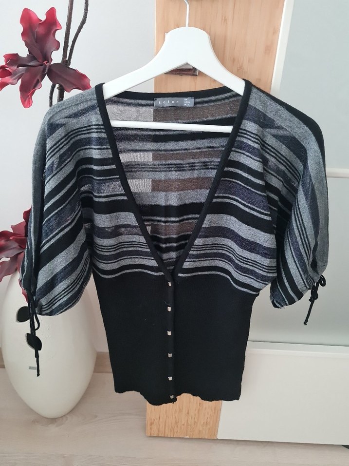 V yaka ve düğmeli kapamalı, kısa kesim, çizgili ve askılı kollu, gri tonlarında triko hırka. Günlük kullanım için uygun, gotik Paris tarzı.