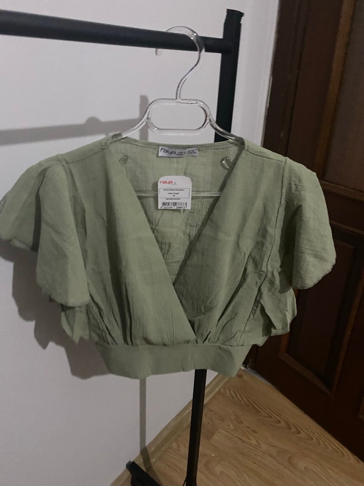 Keten kumaştan, kısa ve bol kesim, V yaka, kısa kollu, düğmeli ve baskılı desene sahip günlük rahat khaki bluz.