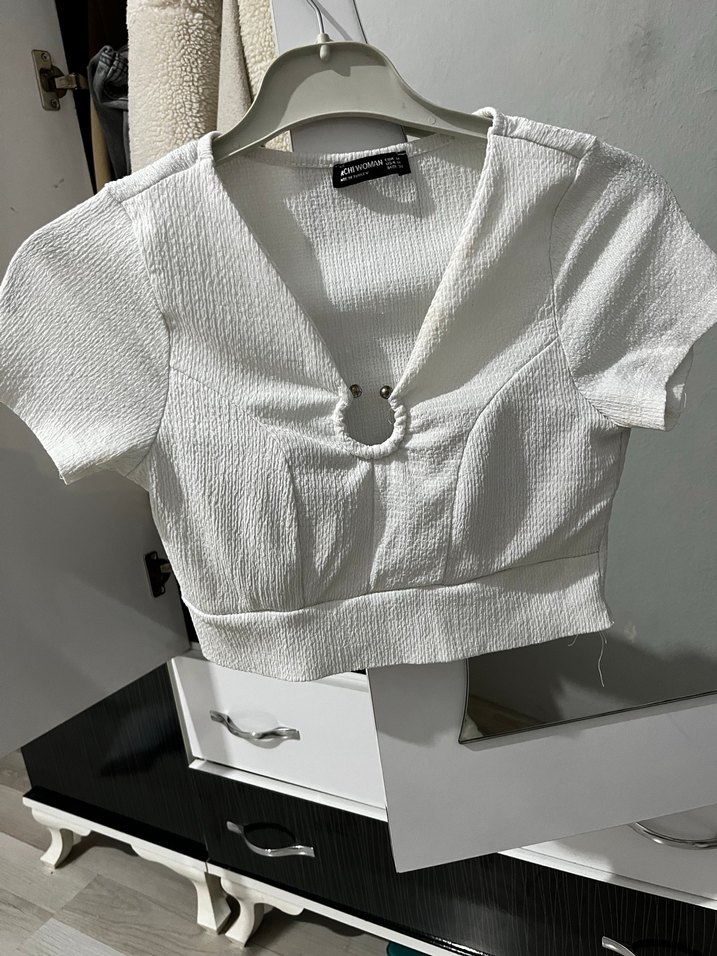 Düğmeli detaylı V yakalı, kısa kollu, beyaz mini bluz. Hafif keten dokusu ile rahat ve şık bir görünüm sunar.