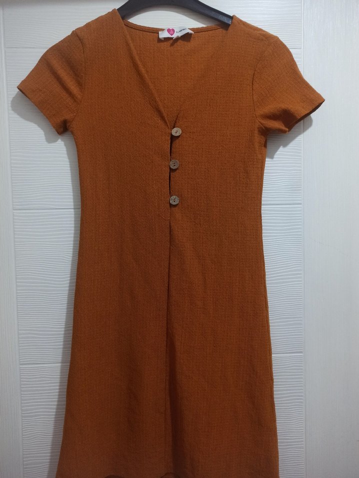 Düğmeli, V yakalı, kısa kollu ve vücuda oturan triko elbise. Turuncu, minimalist ve sokak tarzına uygun.