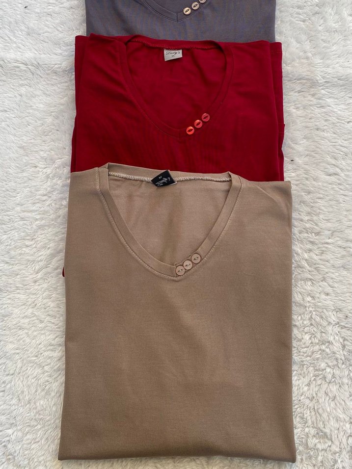 Pamuklu, kısa kollu, düğmeli V yakalı kadın tişörtleri. Kahverengi, kırmızı ve gri renk seçenekleriyle günlük kullanıma uygun rahat kesim.