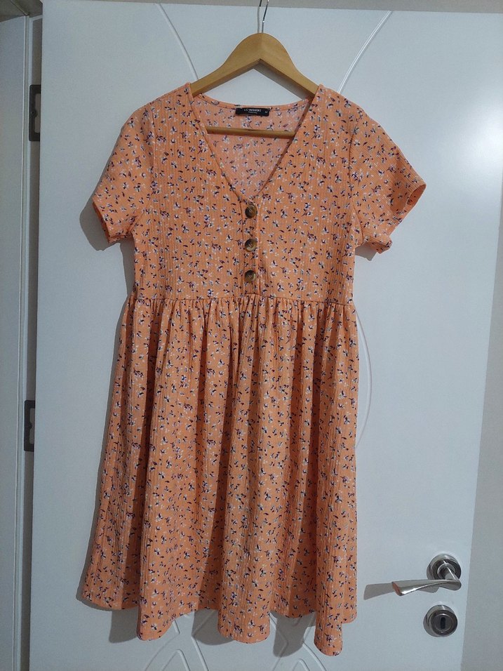 Düğmeli ön kısmı ve V yaka kısa kollu, bol kesim mini elbise. Yumuşak sentetik kumaştan, pastel bej tonlarında batik desenli, günlük sokak tarzı için uygun.