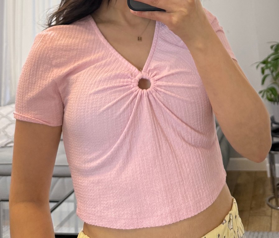 Düğmeli V Yaka Kısa Kollu Pembe Bluz