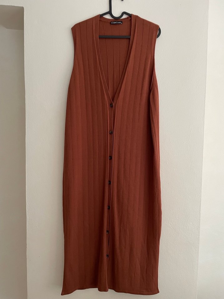 Kolsuz, V yaka ve düğmeli uzun triko yelek Rahat bol kesim, minimalist ve desensiz tasarım, koyu bej renkte, günlük kullanıma uygun.