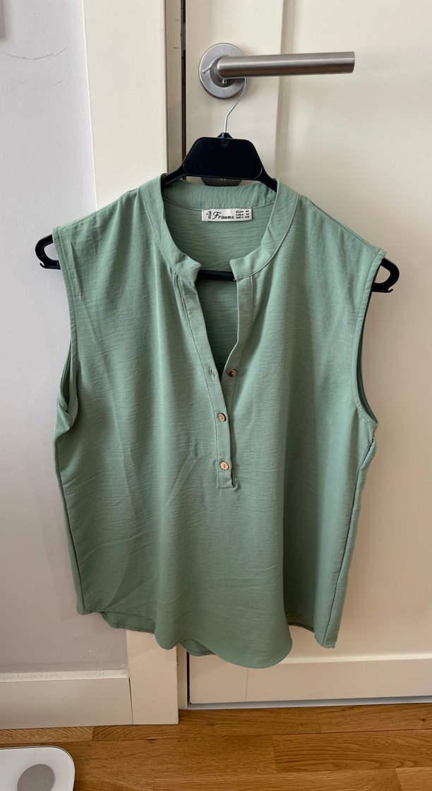 Düğmeli V yaka, kolsuz, yeşil keten bluz. Rahat kesim, midi boy, pastel tonlarda sade tasarım.