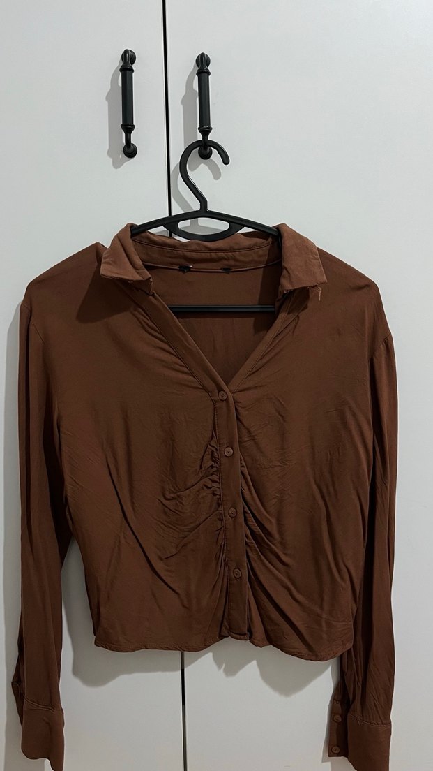 Uzun kollu, V yakalı ve düğmeli bu dar kesim kadın gömlek, yumuşak keten kumaştan yapılmıştır. Koyu kahverengi ve minimal tasarıma sahiptir, günlük kullanım için uygundur.