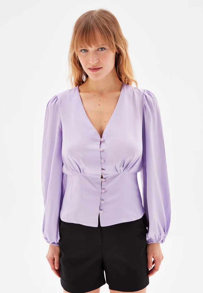 Lila renkte, düğmeli ve V yakalı uzun kollu bluz. İpek gibi dokusu, bol kesimi ve minimal tasarımıyla ofis için uygundur. Sorunsuzdur bir kaç kez giydim sadece çok kırışık