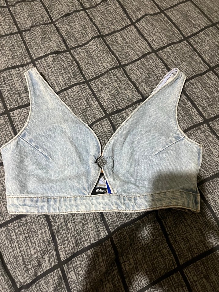 Düğmeli, V yakalı ve kolsuz denimden yapılmış, normal boyda, mavi-gri tonlarında, günlük kullanıma uygun, fitted kesim kadın yelek.