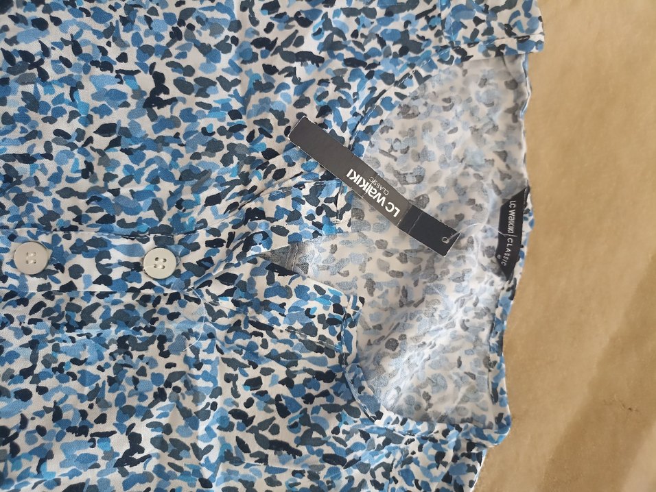 Düğmeli önden kapamalı, V yakalı, mavi desenli, sentetik kumaştan, kısa kollu, bol kesim ve midi boy kadın gömleği. Rahat ve günlük kullanıma uygun.